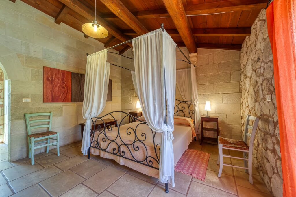 Tortora is a nice room of 25 square meters, with air conditioning / heating and bathroom complete with shower and sanitary. Cozy and bright, overlooking the greenery of the Masseria with two windows, one of which is the entrance to the room. It has floor in Lecce stone and wooden pitched roof with roof tiles and roof tiles. Inside wooden furniture, double canopy bed, small table with chairs.