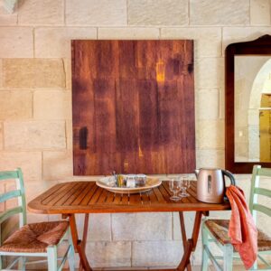 Tortora è una bella camera di 25 mq, ha aria condizionata/riscaldamento e bagno con sanitari completi e doccia. Accogliente e luminosa, affaccia nella zona a verde della Masseria con due vetrate di cui una è l’ingresso della camera. Ha pavimento in pietra leccese e tetto a falda in legno con coppi ed embrici. All’interno mobili in legno, letto matrimoniale a baldacchino, tavolino con sedie.